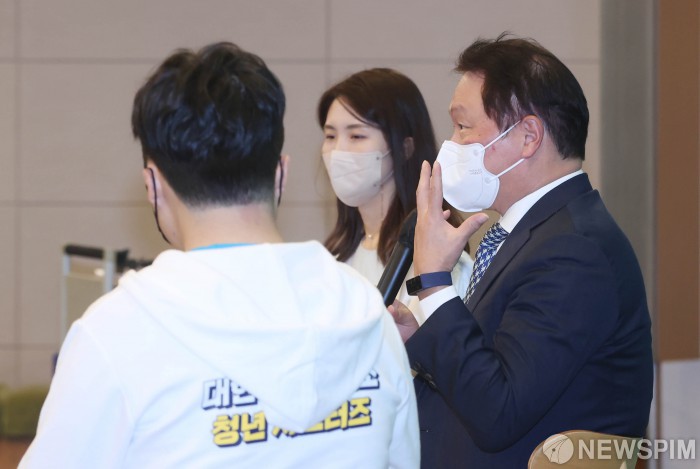 [서울=뉴스핌] 김민지 기자 = 최태원 대한상공회의소 회장이 14일 오전 서울 중구 대한상의에서 열린 청년 서포터즈 V.I.P 발대식에서 청년들과 대화를 하고 있다. 2022.09.14 kimkim@newspim.com