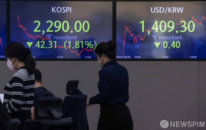 [서울=뉴스핌] 윤창빈 기자 = 23일 코스피는 전 거래일(2332.31)보다 42.31포인트(1.81%) 내린 2290.00에 장을 마쳤다. 코스닥지수는 전 거래일(751.41)보다 22.05포인트(2.93%) 하락한 729.36에 거래를 종료했다. 서울 외환시장에서 원·달러 환율은 전 거래일(1409.7원)보다 0.4원 내린 1409.3원에 마감했다.이날 서울 중구 하나은행 딜링룸에서 딜러들이 업무를 보고 있다. 2022.09.23 pangbin@newspim.com