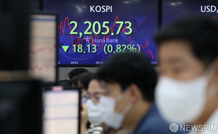 [서울=뉴스핌] 정일구 기자 = 28일 코스피 지수가 전 거래일보다 17.71포인트(0.80%) 하락한 2206.15에 출발했다. 코스닥 지수는 전 거래일 대비 1.73포인트(0.25%) 내린 696.38에 시작했다. 원·달러 환율은 전 거래일보다 4원 오른 1425.5원에 장을 열었다. 이날 오전 서울 중구 하나은행 딜링룸에서 딜러들이 업무를 보고 있다. 2022.09.28 mironj19@newspim.com