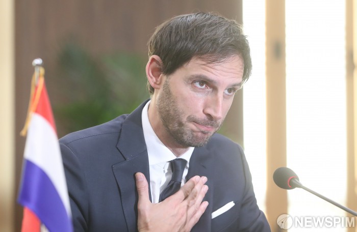 [서울=뉴스핌] 김학선 기자 = 웝크 훅스트라 네덜란드 외교장관이 28일 서울 종로구 외교부 청사에서 열린 한-네덜란드 외교장관회담에서 발언하고 있다. 2022.09.28 yooksa@newspim.com