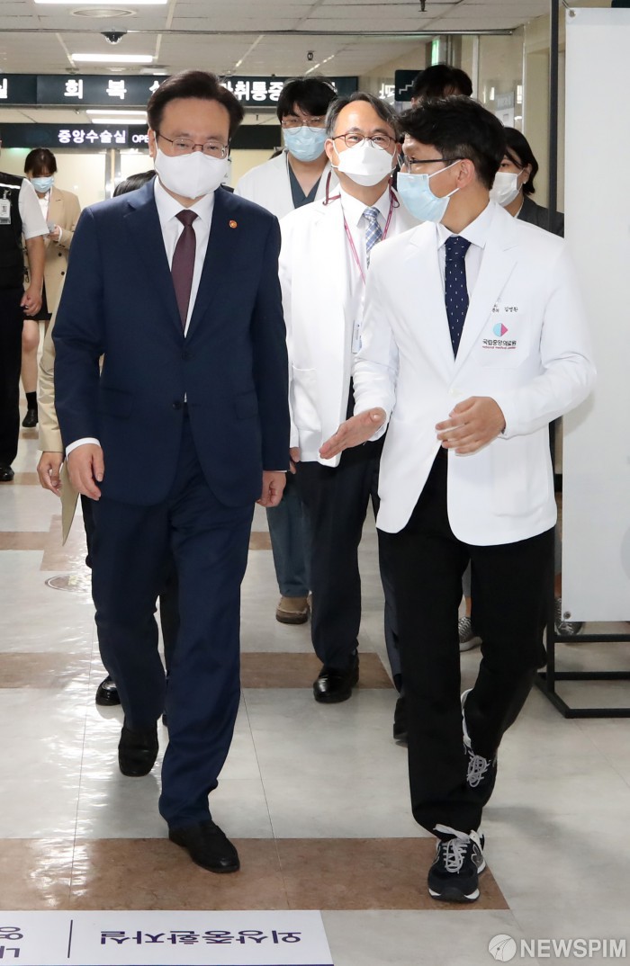 [서울=뉴스핌] 황준선 기자 = 조규홍(왼쪽) 보건복지부 장관이 7일 오후 서울 중구 국립중앙의료원을 찾아 김영환 서울권역외상센터장으로부터 외상중환자실 운영에 대한 설명을 듣고 있다. 가운데는 주영수 국립중앙의료원장. 2022.10.07 hwang@newspim.com