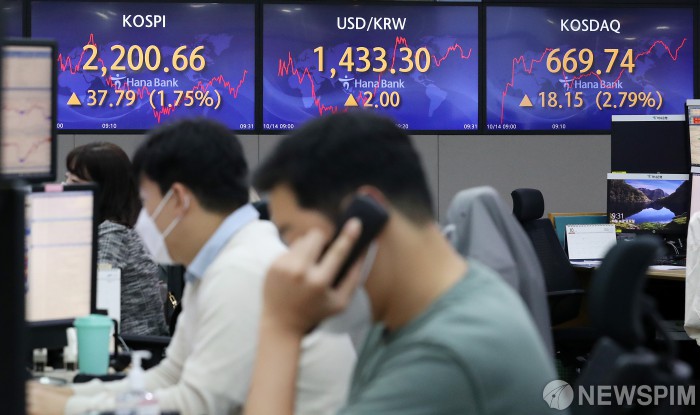 [서울=뉴스핌] 정일구 기자 = 14일 코스피 지수가 전 거래일보다 37.79포인트(1.75%) 상승한 2200.66에 출발했다. 코스닥 지수는 전 거래일 대비 13.58포인트(2.08%) 오른 665.17에 시작했다. 원·달러 환율은 전 거래일보다 0.2원 오른 1431.5원에 장을 열었다. 이날 오전 서울 중구 하나은행 딜링룸에서 딜러들이 업무를 보고 있다. 2022.10.14 mironj19@newspim.com