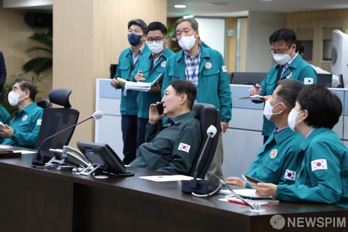 [서울=뉴스핌] 윤석열 대통령이 30일 오전 용산 대통령실 청사 국가위기관리센터에서 열린 이태원 핼러윈 사고 긴급상황점검회의에 참석해 사고 관련 보고를 받고 있다. [사진=대통령실] 2022.10.30 photo@newspim.com