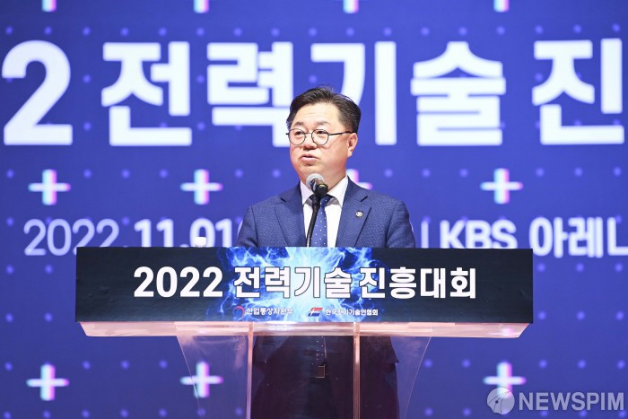 [서울=뉴스핌]박일준 산업통상자원부 2차관이 1일 서울 강서구 KBS아레나홀에서 열린 2022 전력기술진흥대회에 참석해 인사말을 하고 있다.이날 행사에는 윤관석 산업통상자원위원장, 김한정·한무경·정일영·김한정 국회의원, 김선복 전기기술인협회장을 비롯한 전기기술인 1,000여명이 참석 했다.[사진= 산업통상자원부] 2022.11.01 photo@newspim.com