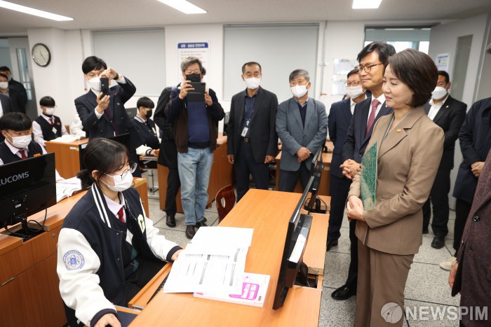 [서울=뉴스핌] 이영 중소벤처기업부 장관이 17일 경북 구미전자공업고등학교를 방문해 직업교육 현장을 둘러보고 있다. [사진=중소벤처기업부] 2022.11.17 photo@newspim.com