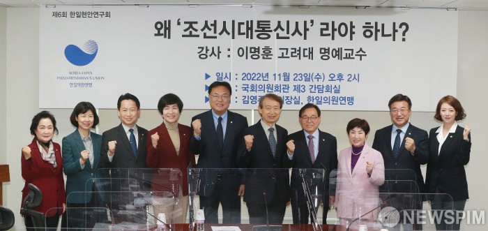 [서울=뉴스핌] 이형석 기자 = 정진석 국민의힘 비상대책위원장과 김영주 국회 부의장을 비롯한 참석자들이 23일 오후 서울 여의도 국회에서 열린 제6회 한일현안연구회 '왜 조선시대통신사 라야 하나?'에서 기념촬영을 하고 있다. 2022.11.23 leehs@newspim.com