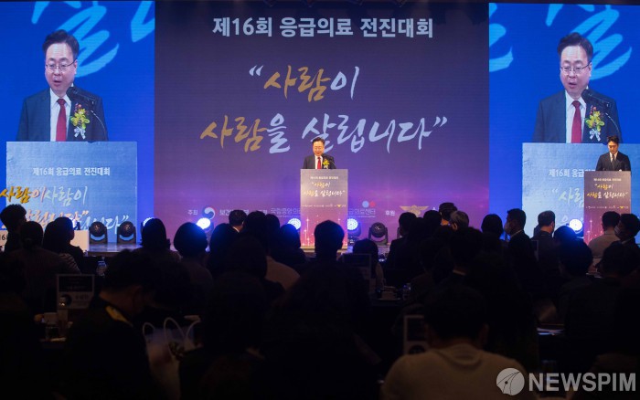 [서울=뉴스핌] 윤창빈 기자 = 조규홍 보건복지부 장관이 12일 오후 서울 송파구 소피텔 앰버서더 호텔에서 열린 제16회 응급의료 전진대회에서 환영사를 하고 있다. 2022.12.12 pangbin@newspim.com