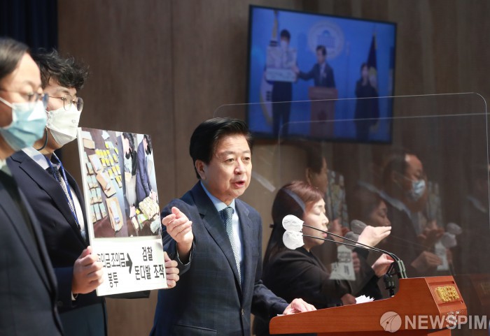 [서울=뉴스핌] 이형석 기자 = 6000만 원의 뇌물과 불법 정치자금을 수수한 혐의를 받고 있는 노웅래 더불어민주당 의원이 14일 서울 여의도 국회 소통관에서 신상 발언을 하고 있다. 이날 노 의원은 검찰이 압수수색을 통해 확보한 돈은 축의금과 조의금 이라며 자신은 불법 정치자금을 받지 않았다고 발언했다. 2022.12.14 leehs@newspim.com