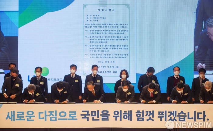 [성남=뉴스핌] 윤창빈 기자 = 이한준 한국토지주택공사 사장과 참석자들이 16일 오전 경기 성남시 한국토지주택공사 경기지역본부에서 열린 LH 혁신 선포 및 청렴 서약식에서 청렴 서약서에 서명을 하고있다. 2022.12.16 pangbin@newspim.com