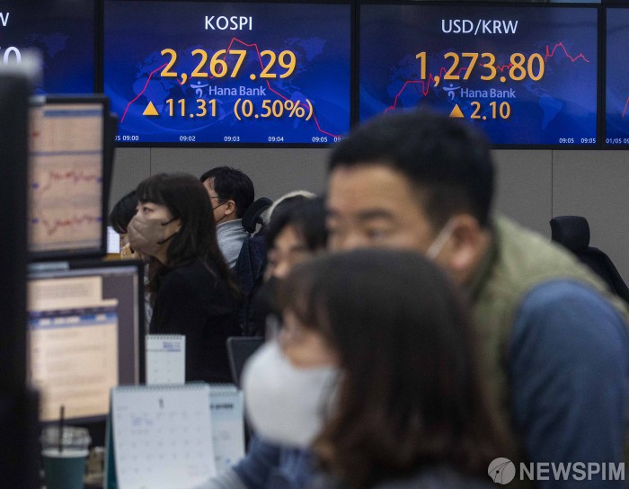 [서울=뉴스핌] 윤창빈 기자 = 5일 코스피는 전 거래일(2255.98)보다 12.22포인트(0.54%) 상승한 2268.20에 개장했다. 코스닥지수는 전 거래일(683.67)보다 2.11포인트(0.31%) 오른 685.78에 거래를 시작했다. 서울 외환시장에서 원·달러 환율은 전 거래일(1271.7원)보다 0.7원 내린 1271.0원에 출발했다. 이날 서울 중구 하나은행 딜링룸에서 딜러들이 업무를 보고 있다. 2023.01.05 pangbin@newspim.com