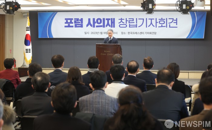 [서울=뉴스핌] 김학선 기자 = 18일 서울 중구 프레스센터에서 열린 문재인 정부 주요 인사들로 구성된 정책포럼 '사의재' 창립 기자회견에서 초대 상임대표를 맡은 박능후 전 보건복지부 장관이 인사말을 하고 있다. '사의재'란 조선시대 정조가 승하한 뒤 다산 정약용이 저서를 편찬하며 머물렀던 처소 이름으로, 문재인 정부의 성과를 계승하자는 의미를 담고 있다. 2023.01.18 yooksa@newspim.com