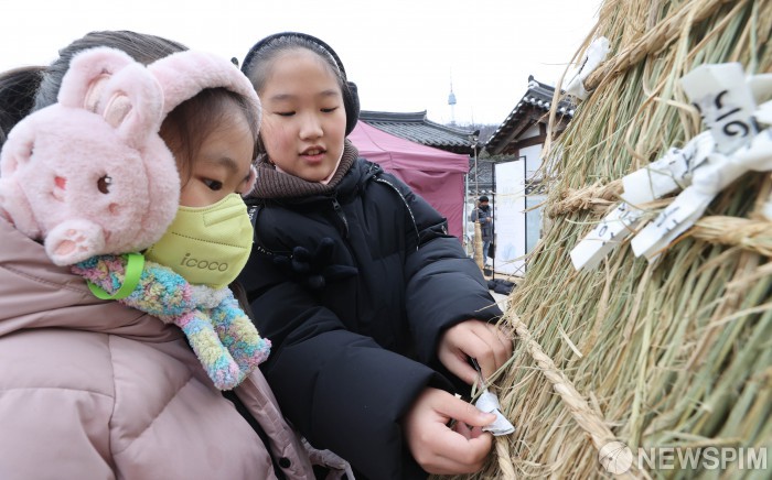 [서울=뉴스핌] 김학선 기자 = 설날인 22일 서울 중구 남산골한옥마을에서 열린 2023 남산골 설축제에서 자매가 새해 소원을 담은 소원지를 소원나무에 매달고 있다. 2023.01.22 yooksa@newspim.com