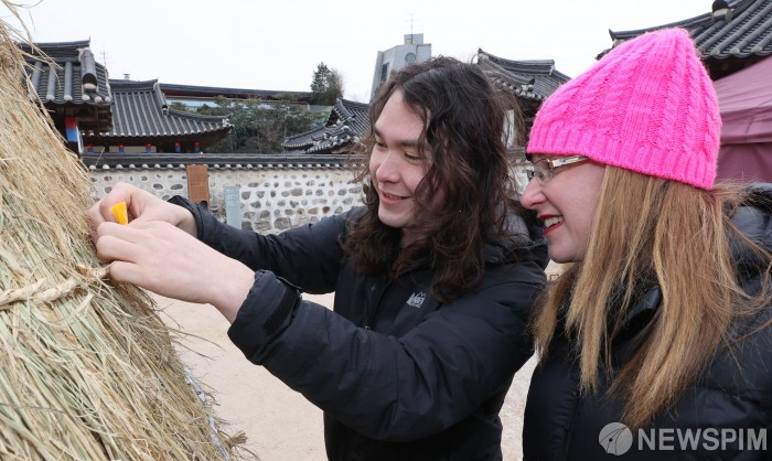[서울=뉴스핌] 김학선 기자 = 설날인 22일 서울 중구 남산골한옥마을에서 열린 2023 남산골 설축제에서 외국인 관광객들이 새해소원을 담은 소원지를 매달고 있다. 2023.01.22 yooksa@newspim.com