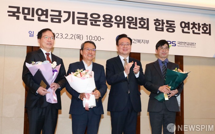 [서울=뉴스핌] 황준선 기자 = 조규홍 보건복지부 장관이 2일 오전 서울 중구 웨스틴조선호텔에서 열린 국민연금기금운용위원회 합동 연찬회에서 국민연금기금위원회 상근전문위원들에게 표창을 수여한 뒤 기념촬영을 하고 있다. 2023.02.02 hwang@newspim.com