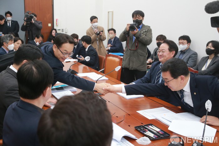 [서울=뉴스핌] 이형석 기자 = 조해진 위원장(왼쪽)이 23일 오후 서울 여의도 국회에서 열린 정치개혁특별위원회의 정치관계법개선소위원회에서 위원들과 악수를 하고 있다. 2023.02.23 leehs@newspim.com