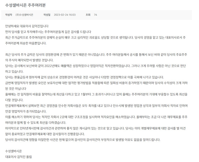김덕진 수성샐바시온 대표는 "최근의 주가 급락은 당사의 경영환경에 큰 변화가 있기 때문이 아니다"며 "주요주주의 주식 매각에 의한 것"이라고 말했다.