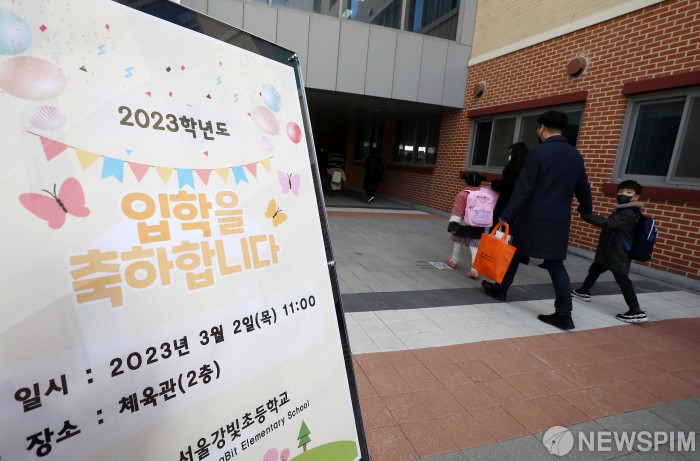 [서울=뉴스핌] 정일구 기자 = 2일 오전 서울 강동구 강빛초등학교에서 1학년 신입생들이 학부모와 함께 입학식에 참석하고 있다. 이날 전국 초·중·고교가 2019년 이후 4년 만에 실내 마스크 착용 의무 없이 대면 입학식을 치르고 새 학기를 시작했다. 2023.03.02 mironj19@newspim.com