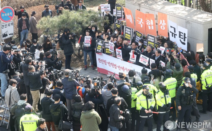 [서울=뉴스핌] 김학선 기자 = 한일역사정의평화행동 회원들이 6일 서울 종로구 외교부 청사 앞에서 정부의 강제동원 굴욕해법 발표 강행을 규탄하는 기자회견을 열고 있다. 2023.03.06 yooksa@newspim.com
