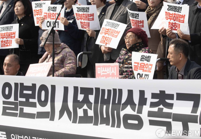 [서울=뉴스핌] 윤창빈 기자 = 일본 강제동원 피해자 양금덕-김성주 할머니가 7일 오후 서울 여의도 국회 본청앞에서 한일역사정의평화행동 주최로 열린 굴욕적인 강제동원 정부해법 강행규탄! 일본의 사죄배상 촉구! 긴급 시국선언에서 피켓을 들고 있다. 2023.03.07 pangbin@newspim.com