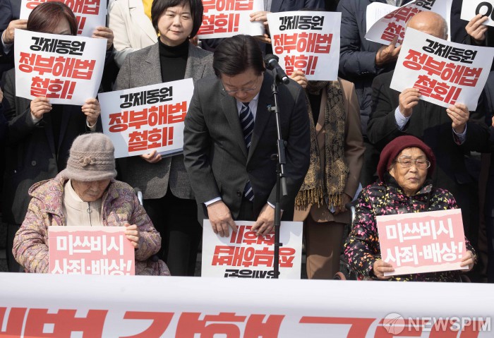 [서울=뉴스핌] 윤창빈 기자 = 이재명 더불어민주당 대표가 7일 오후 서울 여의도 국회 본청앞에서 한일역사정의평화행동 주최로 열린 굴욕적인 강제동원 정부해법 강행규탄! 일본의 사죄배상 촉구! 긴급 시국선언에서 발언을 마치고 인사하고 있다. 2023.03.07 pangbin@newspim.com