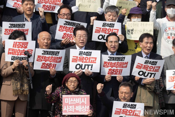 [서울=뉴스핌] 윤창빈 기자 = 일본 강제동원 피해자 김성주 할머니, 양금덕 할머니, 이재명 더불어민주당 대표 등 참석자들이 7일 오후 서울 여의도 국회 본청앞에서 한일역사정의평화행동 주최로 열린 굴욕적인 강제동원 정부해법 강행규탄! 일본의 사죄배상 촉구! 긴급 시국선언에서 구호를 외치고 있다. 2023.03.07 pangbin@newspim.com