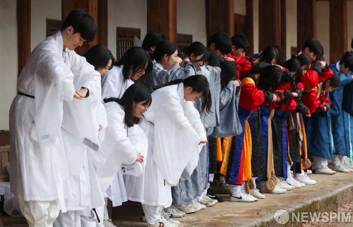 [서울=뉴스핌] 황준선 기자 = 12일 오전 서울 종로구 성균관대학교에서 열린 '2023 신방례(新榜禮)'에서 신입생들과 선배들이 상읍래(相揖禮)를 하고 있다. '신방례(新榜禮)'는 성균관 신입생들의 환영식이자 선배들이 신입 유생들을 대상으로 치렀던 일종의 통과의례다. 2023.03.12 hwang@newspim.com