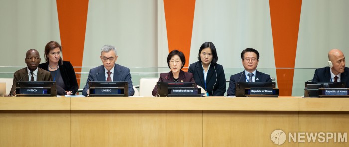 [서울=뉴스핌] 한화진 환경부 장관이 24일 오전(현지시간) 미국 뉴욕 UN본부에서 열린 ‘과학기반의 글로벌 물 평가’ 토론회에 참석해 기조연설을 하고 있다. [사진=환경부 ]2023.03.25 photo@newspim.com