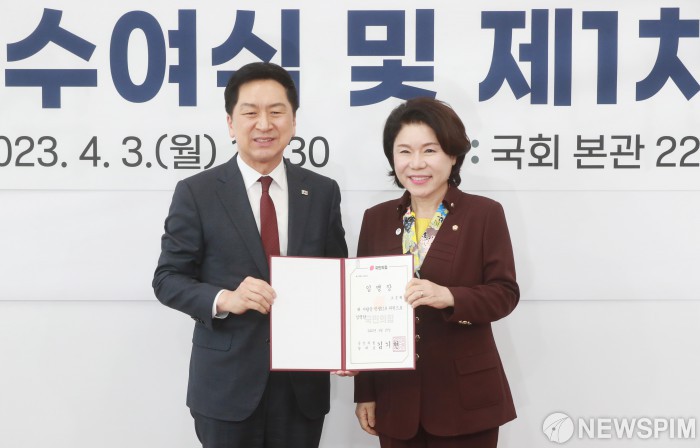 [서울=뉴스핌] 이형석 기자 = 김기현 국민의힘 대표(왼쪽)가 3일 오전 서울 여의도 국회에서 열린 민생119 임명장 수여식 및 제1차 회의에서 조은희 위원에게 임명장을 전달하고 있다. 2023.04.03 leehs@newspim.com