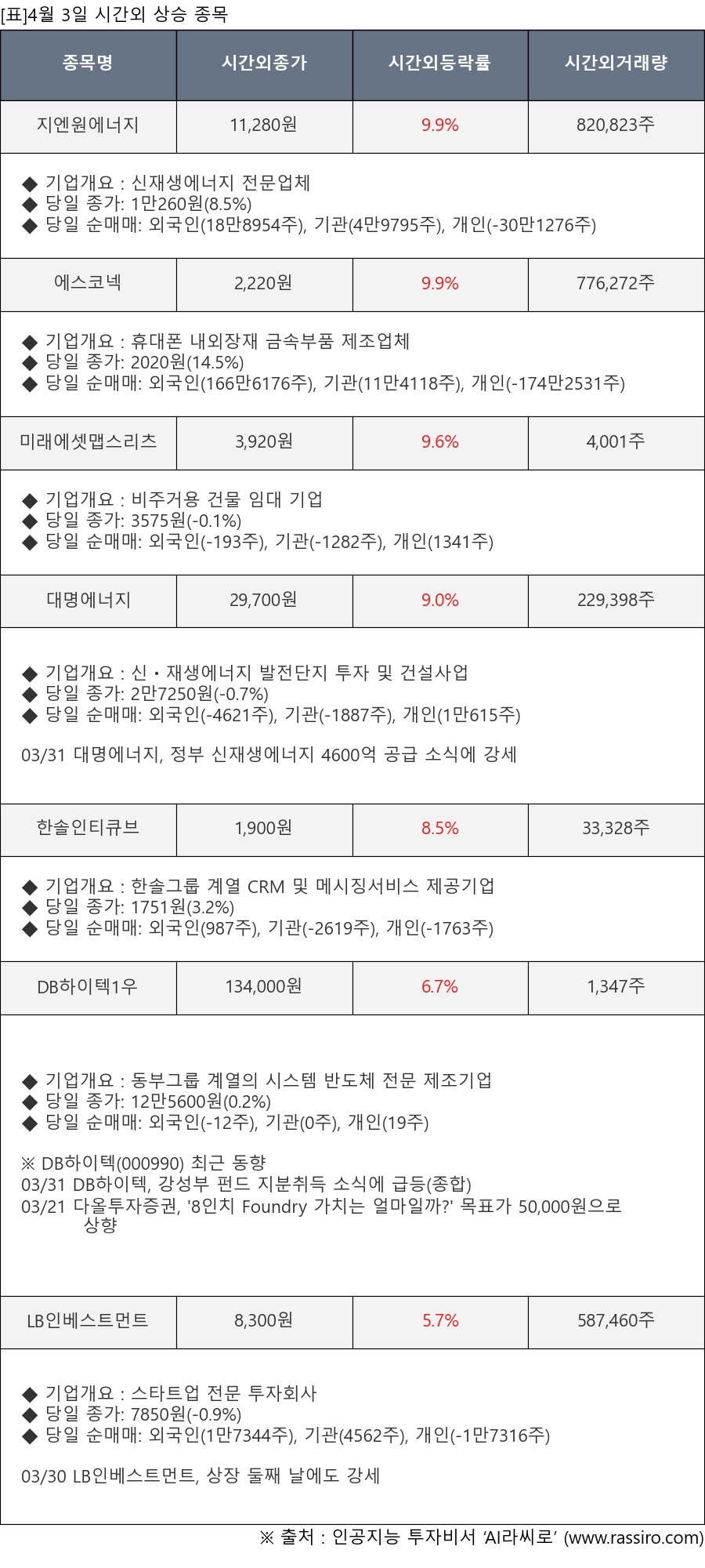 ※ 관련 종목: 지엔원에너지, 에스코넥, 미래에셋맵스리츠, 대명에너지, 한솔인티큐브, DB하이텍1우, LB인베스트먼트