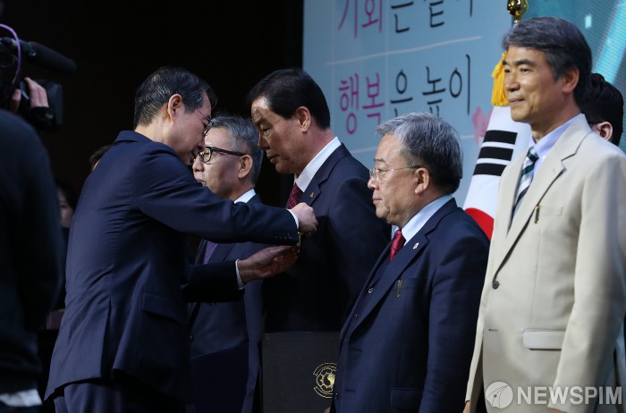 [서울=뉴스핌] 정일구 기자 = 한덕수 국무총리가 20일 오전 서울 여의도 63컨벤션센터에서 열린 제43회 장애인의 날 기념식에서 유공자 포상 및 올해의 장애인상을 시상하고 있다. 2023.04.20 mironj19@newspim.com