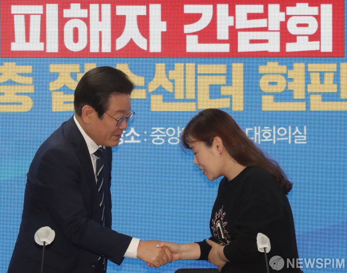[서울=뉴스핌] 이형석 기자 = 이재명 더불어민주당 대표가 24일 오후 서울 영등포구 여의도 민주당 중앙당사에서 열린 '당대표·전세사기 피해자 간담회 및 전세사기 피해 고충 접수센터 현판식'에서 안상미 전세사기깡통전세피해자전국대책위원장과 악수를 나누고 있다. 2023.04.24 leehs@newspim.com