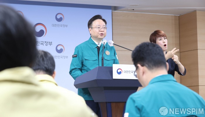[서울=뉴스핌] 김학선 기자 = 조규홍 중앙재난안전대책본부 제1차장(보건복지부 장관)이 11일 정부서울청사에서 코로나19 중대본 정례브리핑을 하고 있다. 정부는 이날 "코로나 위기경보를 '심각'에서 '경계'로 조정, 확진자 7일 격리 의무를 5일 권고로 전환하며 입국 후 PCR 권고도 해제한다"고 밝혔다. 또한 "입원 병실이 있는 병원 이외 모든 장소에서의 실내 마스크 착용 의무를 해제한다"고 발표했다. 2023.05.11 yooksa@newspim.com