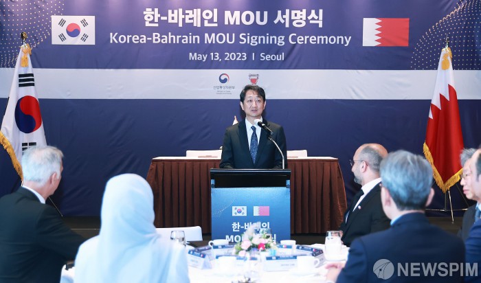 [서울=뉴스핌] 안덕근 산업통상자원부 통상교섭본부장이 13일 서울 용산구 그랜드하얏트호텔에서 열린 한-바레인 무역·투자 촉진을 위한 MOU 체결식에서 인사말을 하고 있다. 이날 서명식에는 압둘라 빈 아델 파크로(H.E. Abdulla Bin Adel Fakhro) 바레인 산업통상부 장관, 유정열 KOTRA 사장, 이재환 한국관광공사 부사장을 비롯한 한-바레인 양국 정부 및 관계기관, 기업 대표 등 관계자가 참석했다.[사진= 산업통상자원부] 2023.05.13 photo@newspim.com