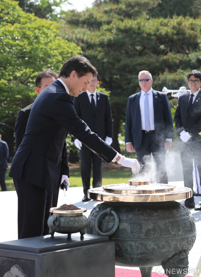 [서울=뉴스핌] 윤창빈 기자 = 쥐스탱 트뤼도 캐나다 총리가 17일 오전 서울 동작구 국립서울현충원을 찾아 분향하고 있다. 2023.05.17 pangbin@newspim.com