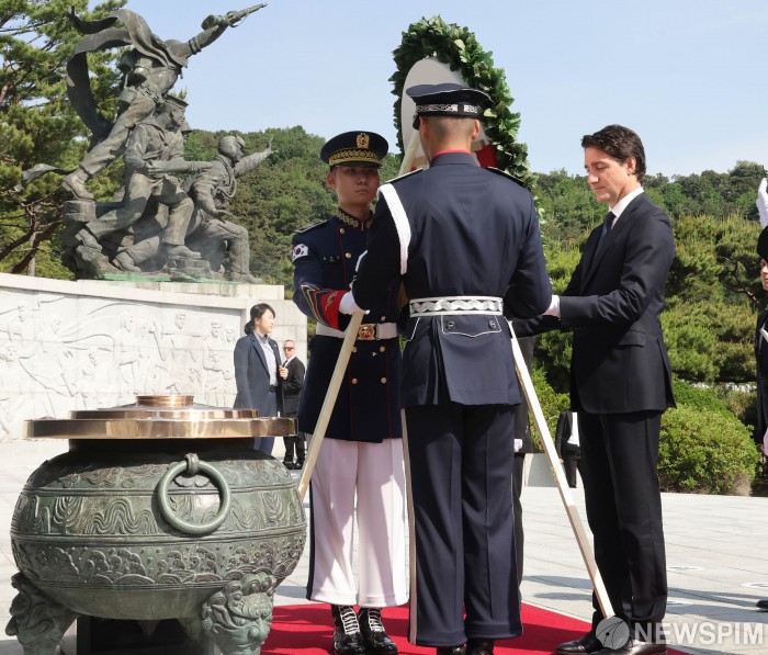 [서울=뉴스핌] 윤창빈 기자 = 쥐스탱 트뤼도 캐나다 총리가 17일 오전 서울 동작구 국립서울현충원을 찾아 헌화하고 있다. 2023.05.17 pangbin@newspim.com