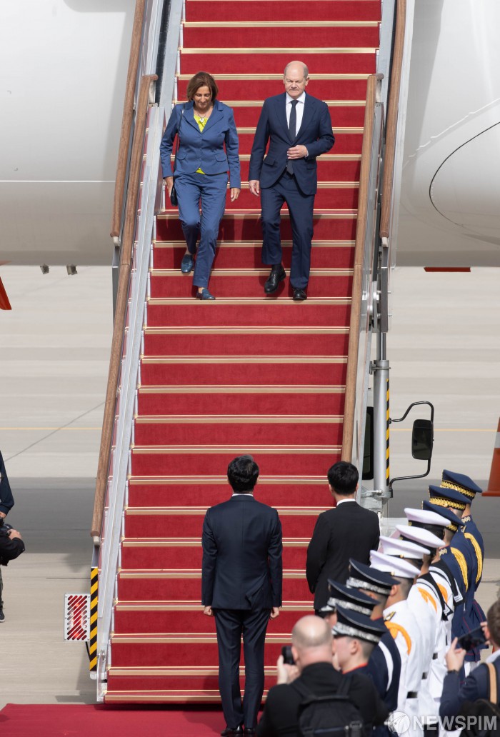 [성남=뉴스핌] 윤창빈 기자 = 올라프 숄츠 독일 총리, 브리타 에르스트 여사가 21일 오후 경기 성남시 서울공항으로 입국해 트랩을 내려오고 있다. 독일 총리가 우리나라 대통령과 양자회담 등을 하기 위해 공식 방한하는 것은 1993년 헬무트 콜 총리 이후 30년 만에 처음이다. 2023.05.21 pangbin@newspim.com