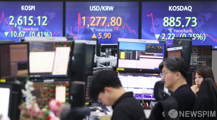[서울=뉴스핌] 이호형 기자 = 19일 코스피가 오전 10..67 하락한 2615.12 지수를 나타냈고 원·달러 환율은 1,277.80,코스닥은 약간 하락한 885.73 기록하고 있다.서울 중구 하나은행 딜링룸에서 딜러들이 업무를 보고 있다. 2023.06.19 leemario@newspim.com