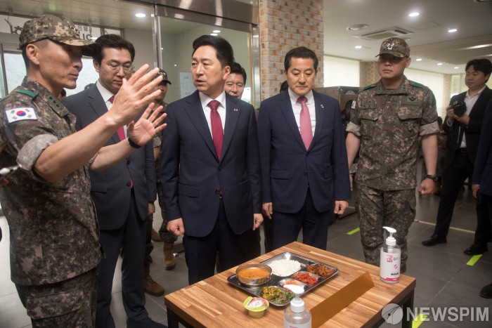 [철원=뉴스핌] 국회사진취재단 = 김기현 국민의힘 대표가 20일 오후 철원 3사단 백골부대를 방문해 장병들과 함께 식사하기 전 부식에 관한 설명을 듣고 있다. 2023.06.20 photo@newspim.com