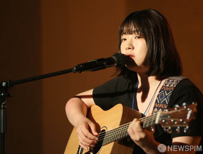 [수원=뉴스핌] 이호형 기자 = 7일 오후 수원 경기문화재단 다산홀에서 열린 국내 최대 유튜브 오디션 '싱어 송 라이터 오디션-음악의 탄생' 네번째 예선 경기지역 대회에서 참가번호 10번 김승욱이 ‘평범’ 곡명으로 경연을 펼치고 있다. 종합통신사 뉴스핌이 주최하고 감 엔터테인먼트에서 주관하는 '싱어 송 라이터 오디션-음악의 탄생'은 유튜브 안다(ANDA)TV를 통해 공개된다. 2023.07.07. leemario@newspim.com