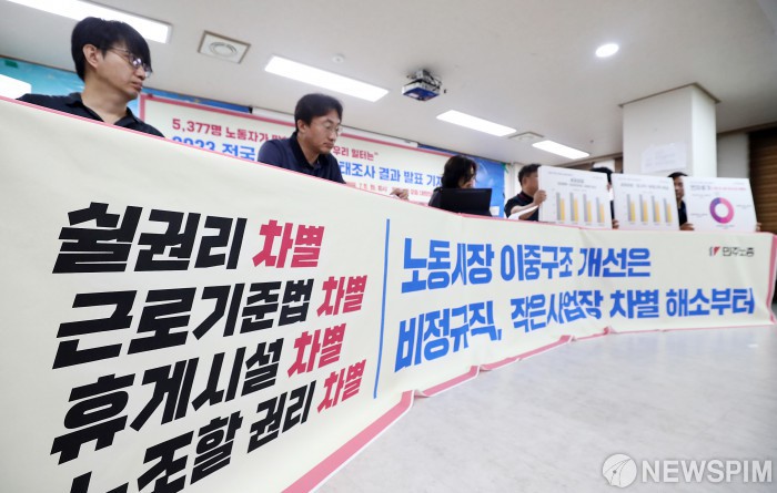 [서울=뉴스핌] 정일구 기자 = 민주노총 관계자들이 11일 오전 서울 중구 민주노총에서 열린 2023년 전국 노동조건 실태조사 발표 기자회견을 하고 있다. 2023.07.11 mironj19@newspim.com