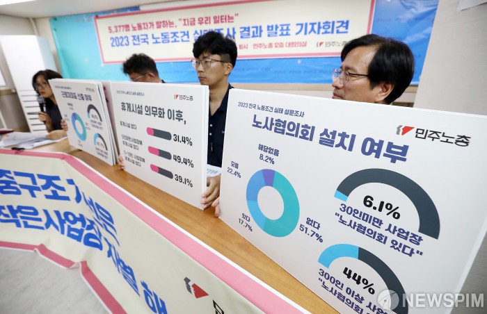 [서울=뉴스핌] 정일구 기자 = 민주노총 관계자들이 11일 오전 서울 중구 민주노총에서 열린 2023년 전국 노동조건 실태조사 발표 기자회견을 하고 있다. 2023.07.11 mironj19@newspim.com