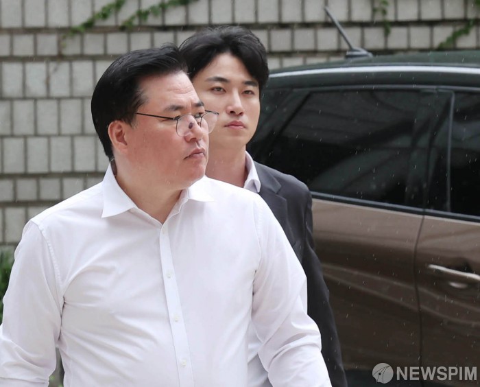 [서울=뉴스핌] 이호형 기자 = 유동규 전 성남도시개발공사 기획본부장이 17일 오후 서초구 서울중앙지방법원에서 열린 대장동 사건 관련 공판에 출석하고 있다. 2023.07.17 leemario@newspim.com