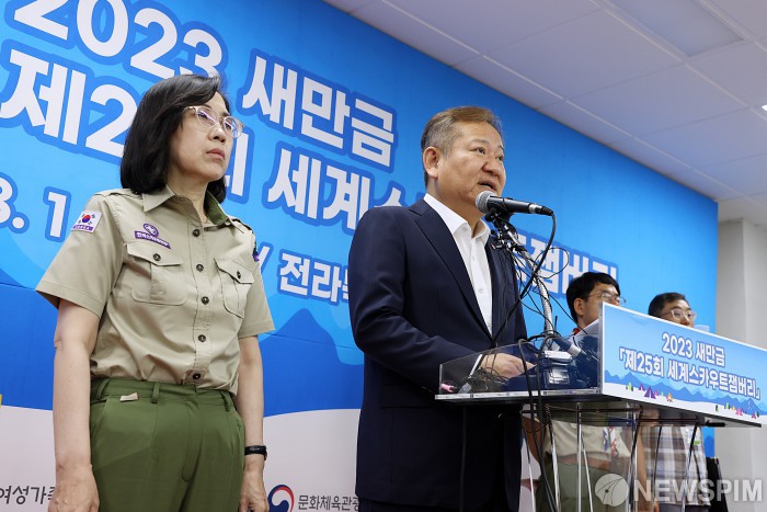 [서울=뉴스핌]이상민 행정안전부 장관이 6일 오전 2023 새만금 세계스카우트잼버리 대회장 내 프레스룸에서 브리핑하고 있다.[사진=행정안전부 ] 2023.08.06 photo@newspim.com
