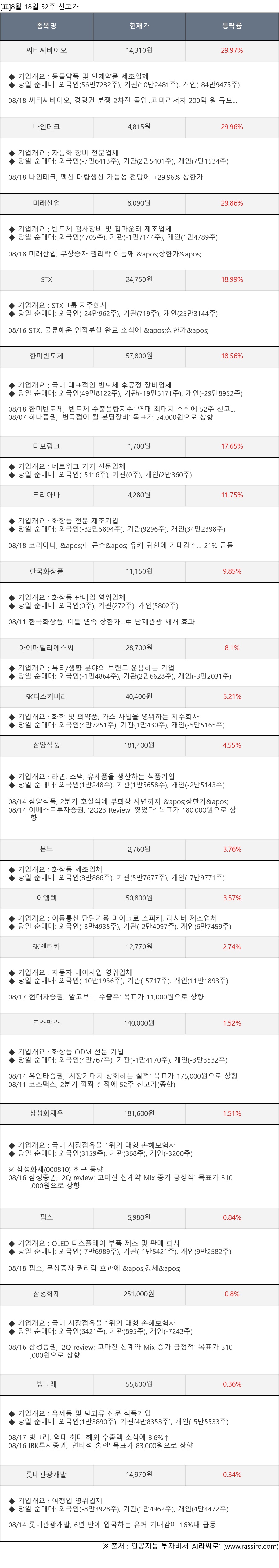 투자자들은 52주 신고가 종목 이외에도 #수주공시_매출액50%이상 , #실시간인기검색어, #52주신고가 등의 태그에 큰 관심을 보였다.