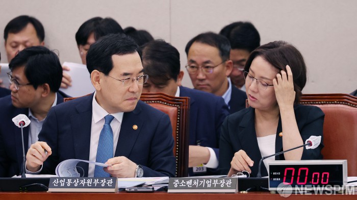 [서울=뉴스핌] 이형석 기자 = 이창양 산업통상자원부 장관(왼쪽)과 이영 중소벤처기업부 장관이 22일 오전 서울 여의도 국회에서 열린 산업통상자원중소벤처기업위원회 전체회의에서 대화를 나누고 있다. 2023.08.22 leehs@newspim.com