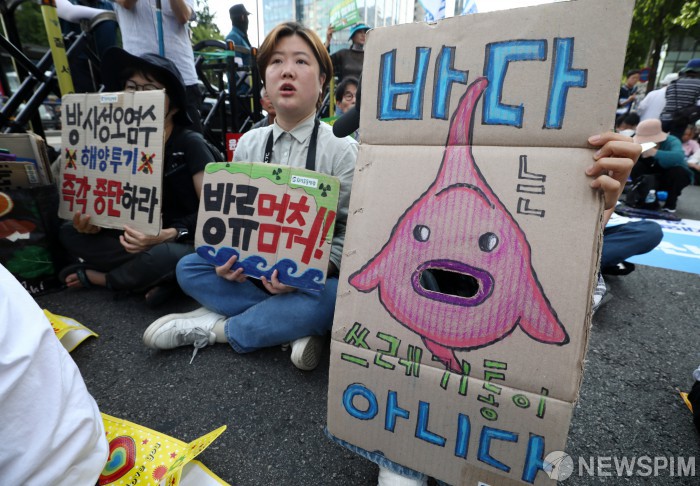 [서울=뉴스핌] 정일구 기자 = 9일 오후 서울 종로구 광화문광장 인근에서 열린 일본 방사성 오염수 해양투기 중단·윤석열정부 규탄 3차 범국민대회에서 참가자들이 손피켓을 들고 있다. 2023.09.09 mironj19@newspim.com