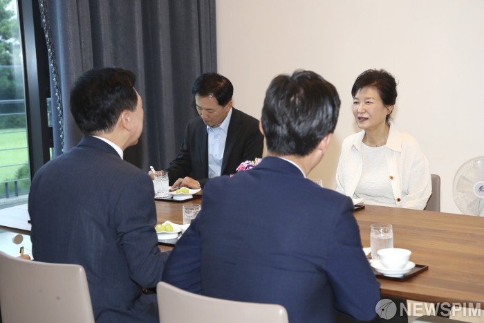[서울=뉴스핌] 박근혜 전 대통령(오른쪽)과 김기현 국민의힘 대표가 13일 대구 사저에서 만나 대화를 나누고 있다. [사진=국민의힘] 2023.09.13 photo@newspim.com