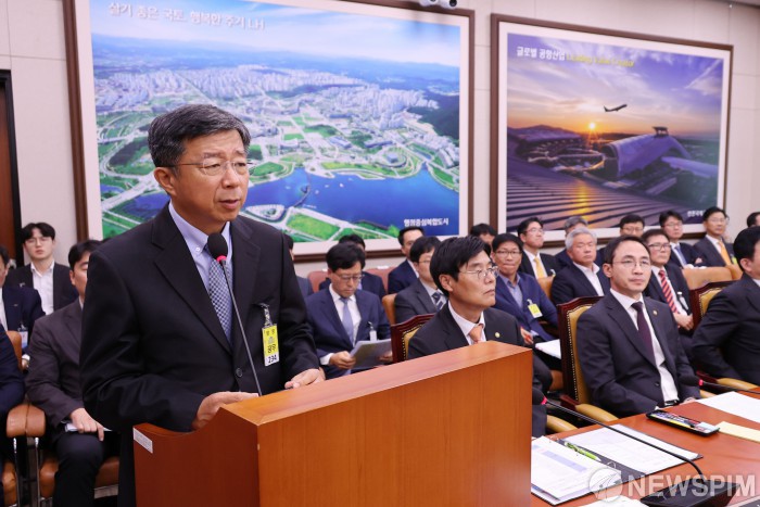 [서울=뉴스핌] 이형석 기자 = 임병용 GS건설 대표이사가 10일 오후 서울 여의도 국회에서 열린 국토교통위원회의 국토교통부, 행정중심복합도시건설청, 새만금개발청 국정감사에서 일반증인으로 출석해 질의에 답하고 있다. 2023.10.10 leehs@newspim.com