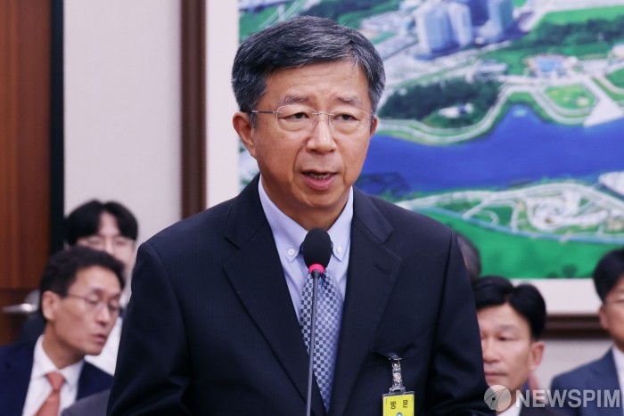 [서울=뉴스핌] 이형석 기자 = 임병용 GS건설 대표이사가 10일 오후 서울 여의도 국회에서 열린 국토교통위원회의 국토교통부, 행정중심복합도시건설청, 새만금개발청 국정감사에서 일반증인으로 출석해 질의에 답하고 있다. 2023.10.10 leehs@newspim.com