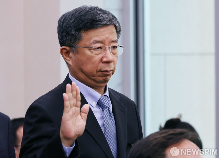 [서울=뉴스핌] 이형석 기자 = 임병용 GS건설 대표이사가 10일 오후 서울 여의도 국회에서 열린 국토교통위원회의 국토교통부, 행정중심복합도시건설청, 새만금개발청 국정감사에서 일반증인으로 출석해 선서를 하고 있다. 2023.10.10 leehs@newspim.com